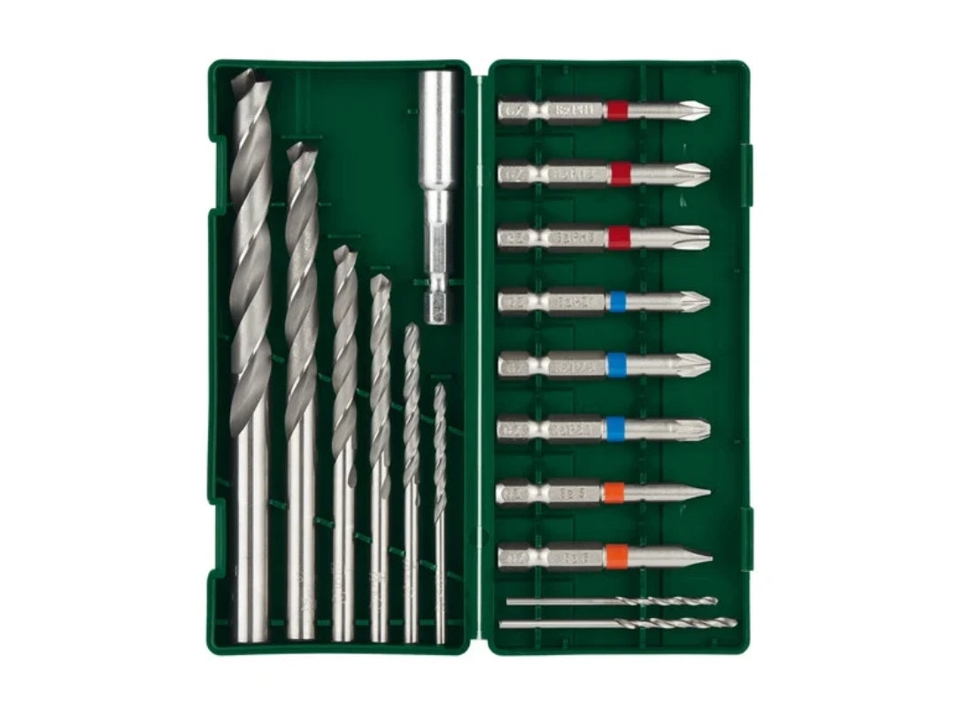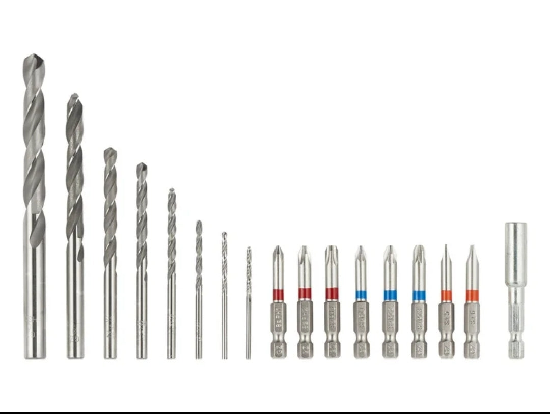💡Включени аксесоари: 8 бита за отвертки (PH1, PH2, PH3 / PZ1, PZ2, PZ3 / SL5, SL6), 8 HSS свредла (2 / 2.5 / 3 / 4 / 5 / 6 / 8 / 10 мм) и 1 конвенционален бит от серията 20 V Group. 💡