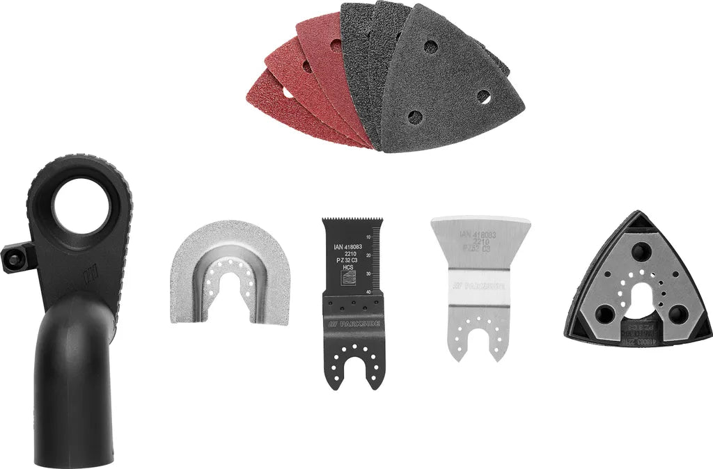 Включени аксесоари: 1x HCS потопяем трион, 1x диамантено острие, 1x заточващо устройство, 1x делта шлифовъчна плоча, 1x адаптер за външно прахоулавяне, 6x шкурки (3x дърво - зърненост 60 / 80 / 120, 3x метал - зърненост 60 / 80 / 120)