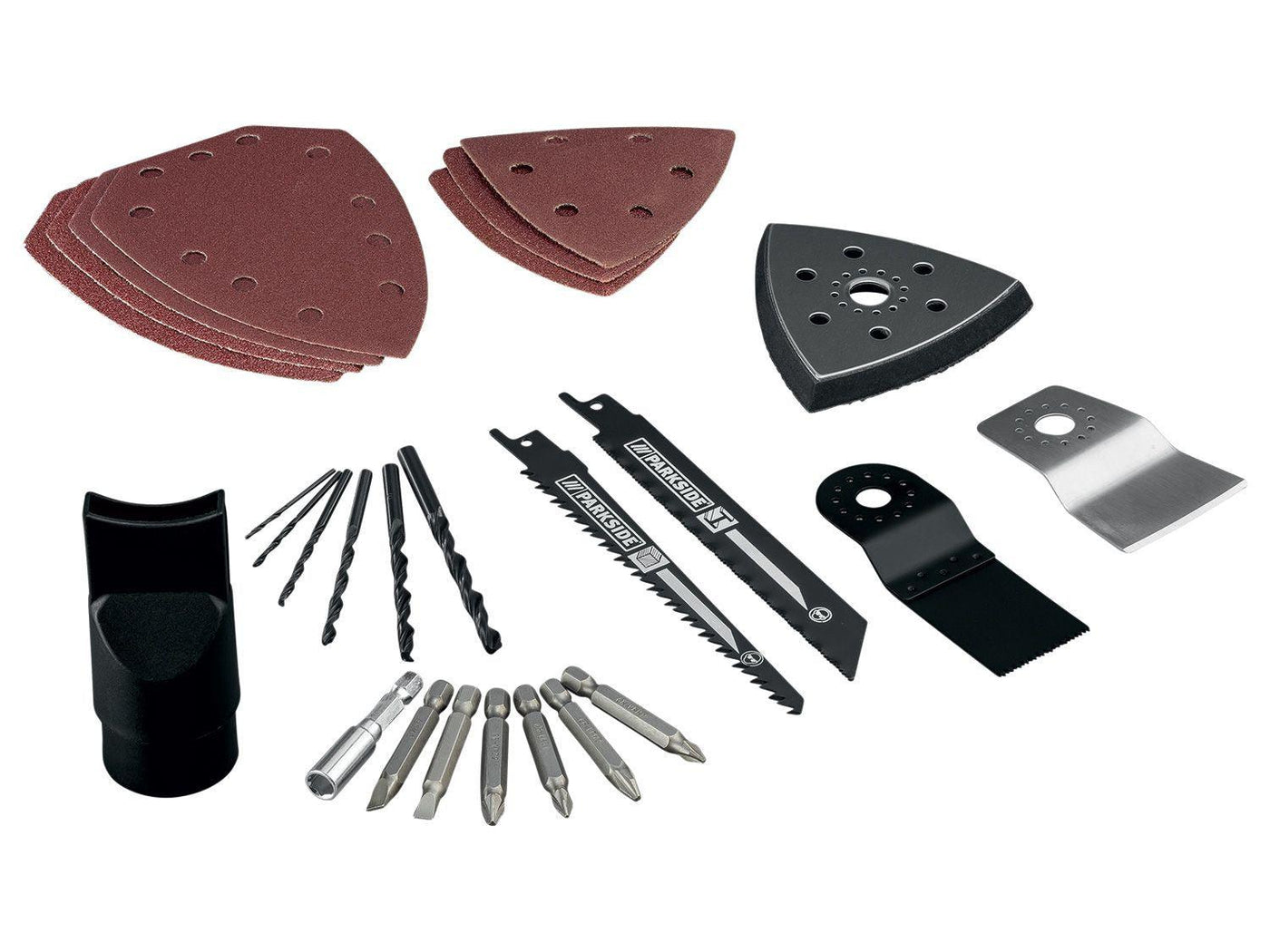 Аксесоари за мултифункционален инструмент: 1x HSS нож за потапяне, 1x рендосвач, 1x делта шлифовъчна плоча, 3x шкурка (1x P 60, 1x P 80, 1x P 120)