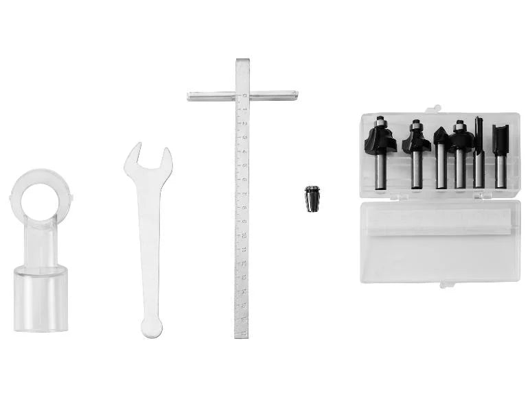 🔹️Аксесоари: Комплект от 6 фрези за дърво (1 профилен фрезер, 1 кръгъл фрезер, 1 V-образен фрезер за канали, 2 фрези за канали, 1 кухинообразен фрезер), 1 успореден ограничител, 1 пръстен, 1 гаечен ключ, 1 адаптер за външно прахоулавяне, Материал: Пластмаса, лят алуминий, Фрезер: Стомана, Размери: Устройство без батерия: приблизително 160 x 85 x 220 мм